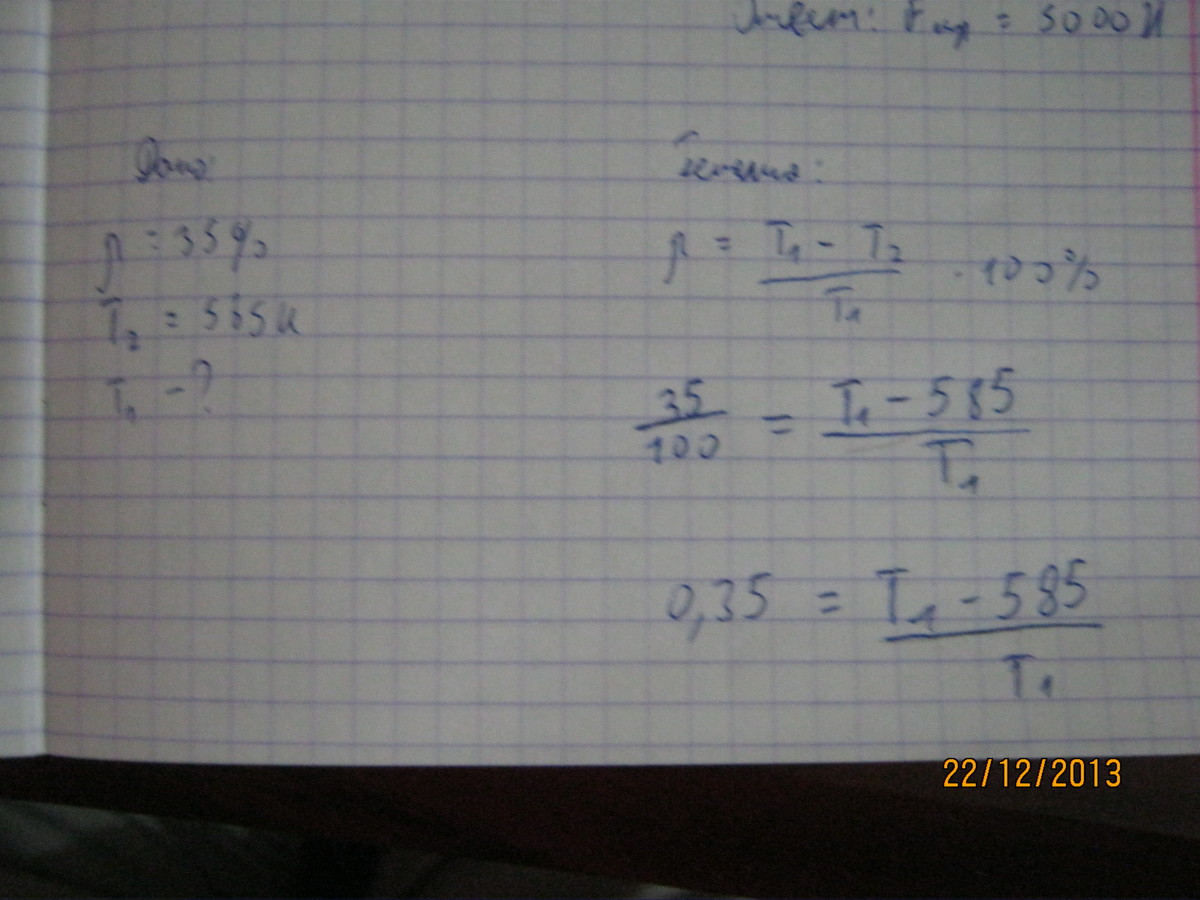 Тепловая машина имеет максимальный КПД 35%. Определить температуру нагревателя, если температура холодильника 585К.