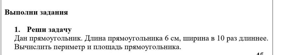 Реши задачу Дан прямоугольник. Длина 6см, ширина в 10 раз длиннее. Вычислить периметр и площадь прямоугольника.