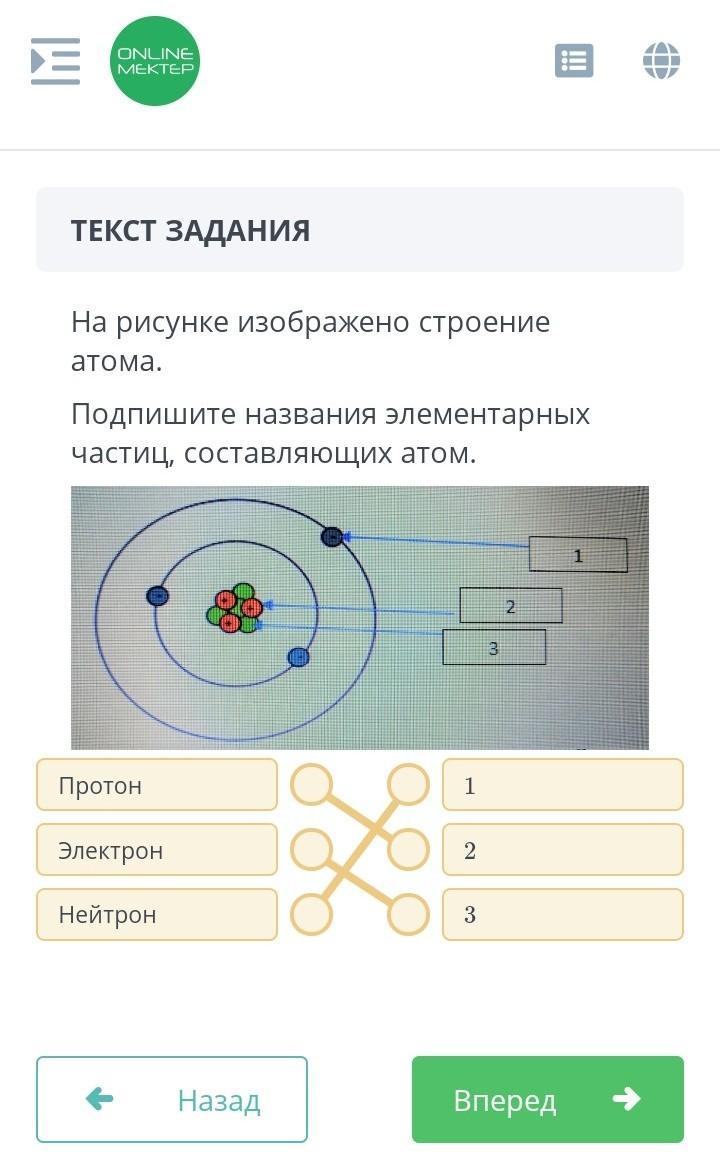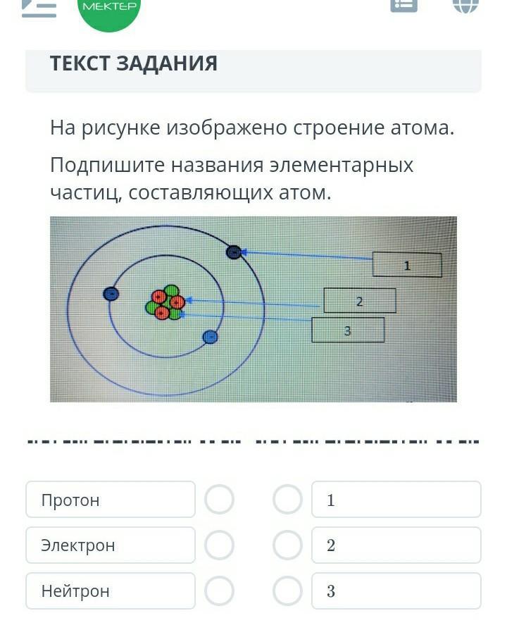 На рисунке изображено строение атома . Подпишите название элементарных частиц составляющих атом. Протон , 1 . Электрон , 2 . Нейтрон , 3