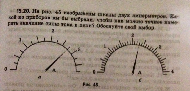 15.20 Точнее является тот прибор у которого цена деления меньше. Очевидно что это прибор справа, потому что у него цена деления 0,1 A,