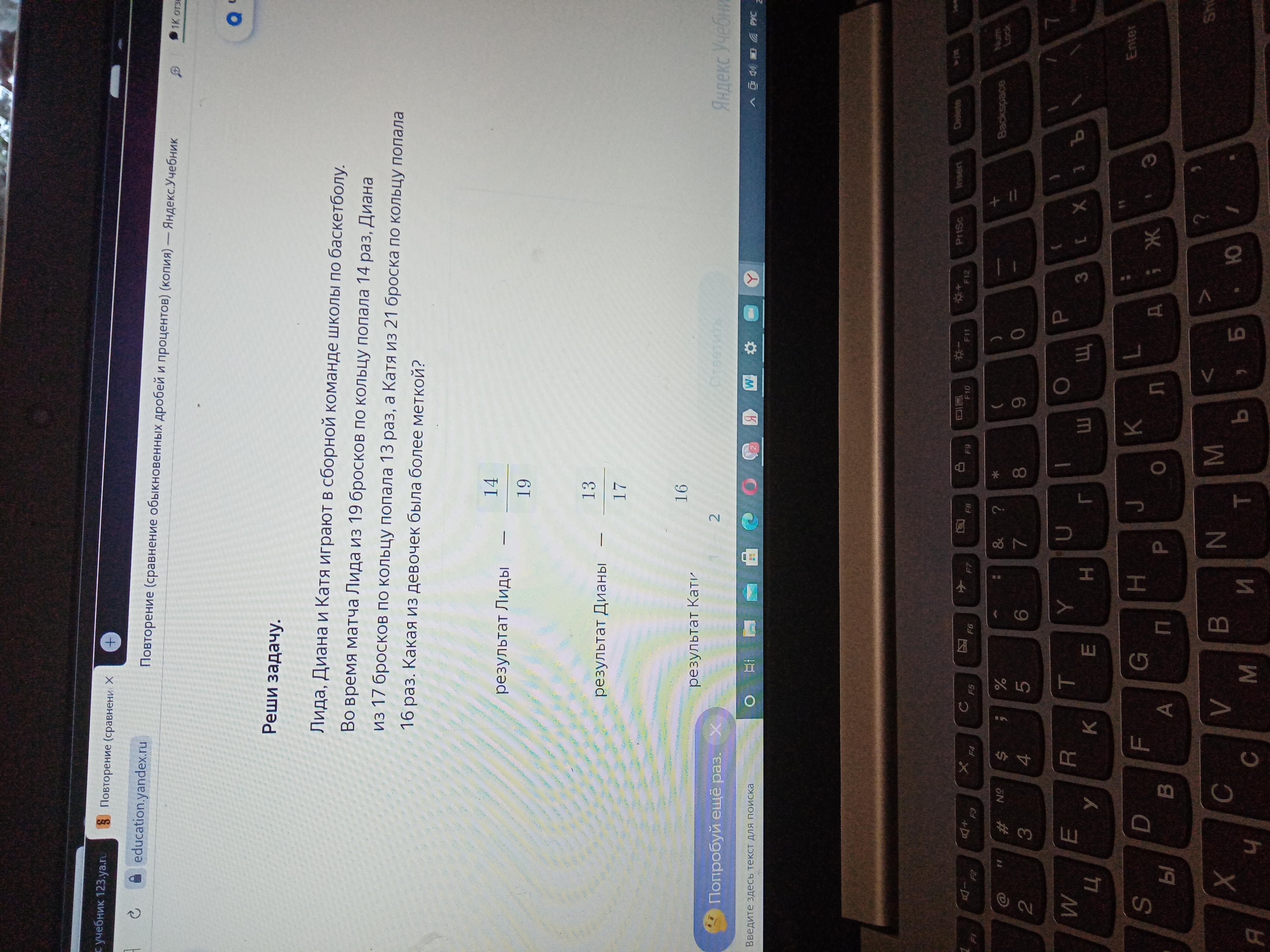 Самая меткая была Диана, т.к. она не попала в кольцо 4 раза (17-13). Катя попала 16 раз, получается 21-16=5, Катя не попала 5 раз и Лида также не попала 5 раз (19-14)