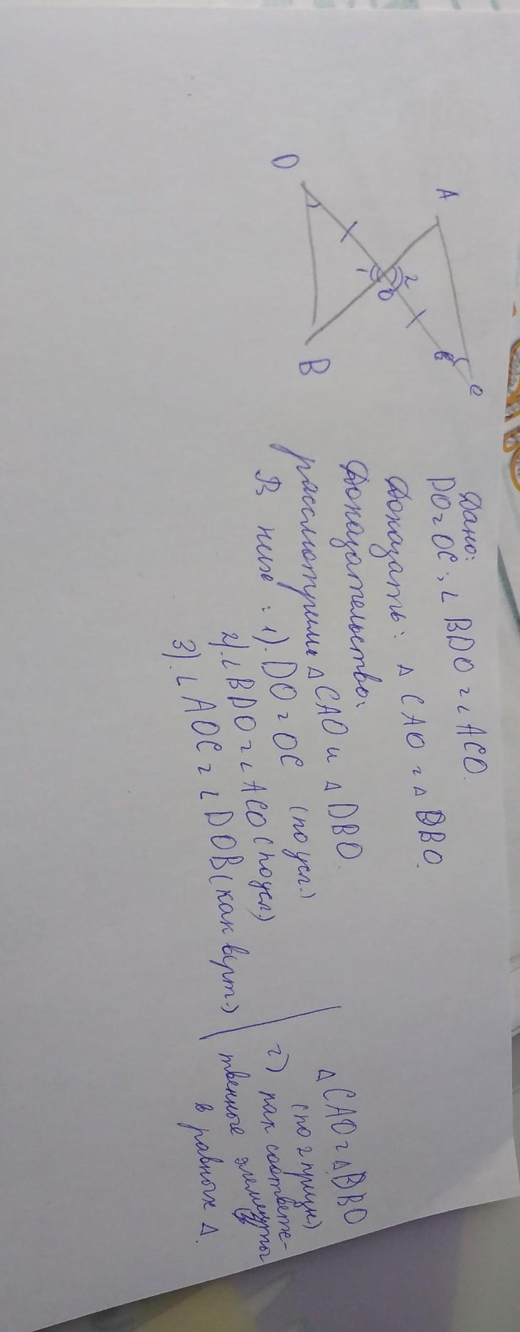 дано: DO=OC углы BDO и ACO равны, докажите что треугольники CAO и DBO равны