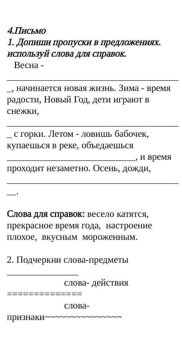 4.Письмо 1. Допиши пропуски в предложениях. ИСПОЛЬзуй слова для справок. Весна - начинается Новая жиЗНЬ. Зима - время радости, Новый Год, дети играют в снежки, — с горки. Летом- ловишь бабочек, купаешься в реке, объедаешься и время проходит незаметно. Осень, дожди, Слова для справок: весело катятся, прекрасное время года, настроение Плохое, вкусным мороженным. 2. Подчеркни слова-предметы Слова- действия СЛова- признаки