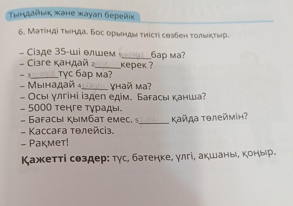 6. Мәтінді тыңда. Бос орынды тиісті сөзбен толықтыр.