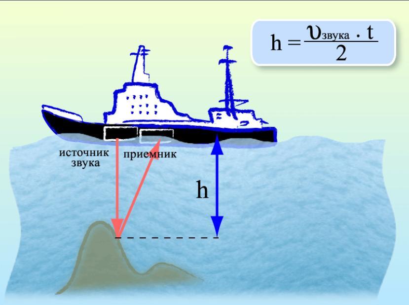 Чтобы определить глубину океана нужно скорость звука (1500 м/с) умножить на путь звукового сигнала (3 сек) и всё это разделить на 2.
