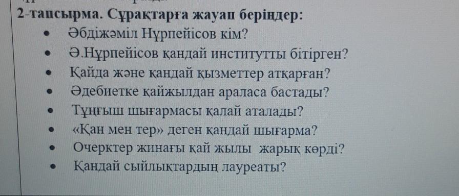 2-тапсырма. Сұрақтарға жауап беріңдер: