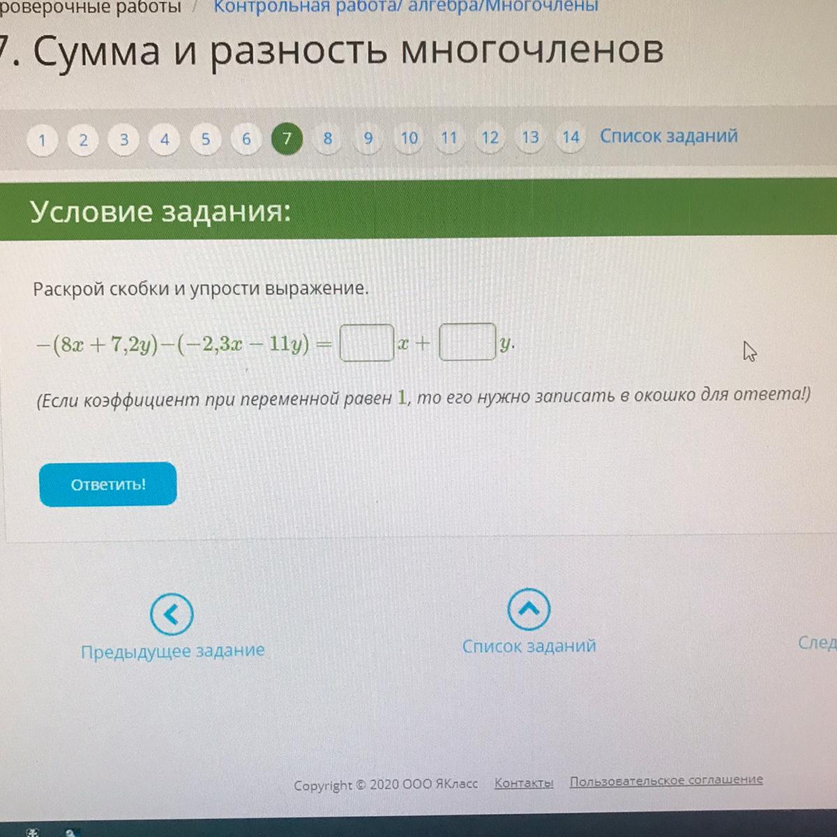 -(8х+7,2у)-(-2,3х-11у)=-8х-7,2у+2,3х+11у=-5,7х+3,8у