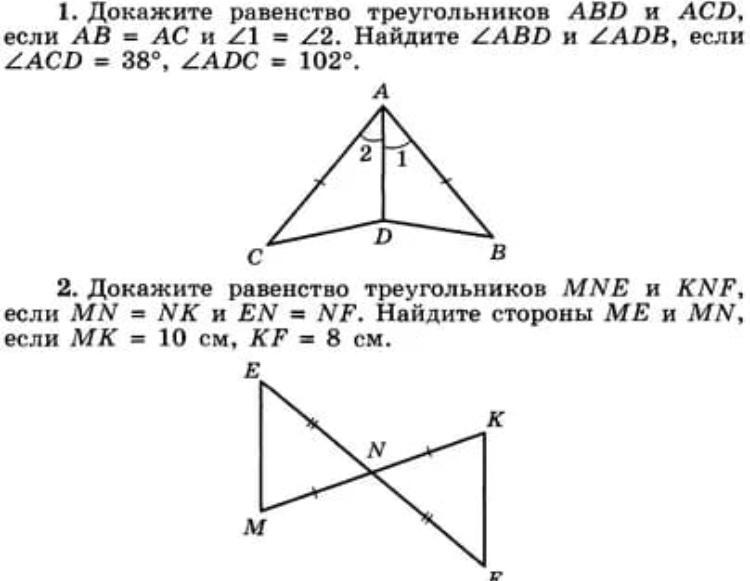 (2). Углы ENM и KNF в треугольниках вертикальные, из этого следует, что они равны. MN=NK, EN=NF, из этого следует, что треугольники MNE и KNF равны по первому признаку равенства треугольников.