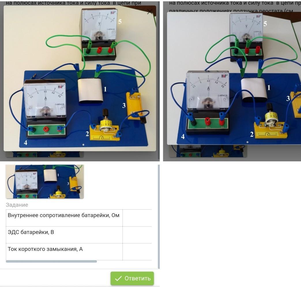 Ученик собрал электрическую цепь, состоящую из батарейки (1), реостата (2), ключа (3), амперметра (4) и вольтметра (5). После этого он измерил напряжение на полюсах источника тока и силу тока в цепи при различных положениях ползунка реостата (см. фотографии). Определите ЭДС, внутреннее сопротивление батарейки и ток короткого замыкания. Результаты занести в таблицу.