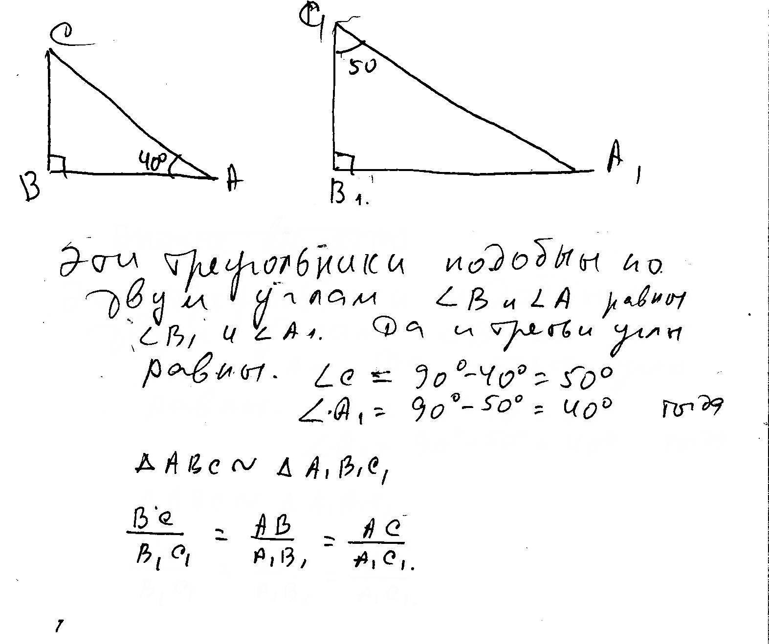 Подобны ли два прямоугольных треугольника, если у одного из них есть угол 40 градусов, а у другого - угол, равный 50 градусов?