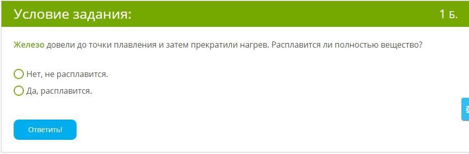 Железо довели до точки плавления и затем прекратили нагрев. Расплавится ли полностью вещество?