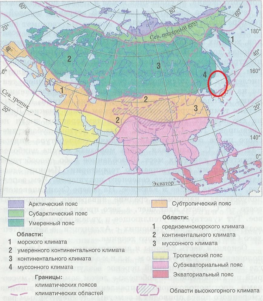 Как видно из карты климатических поясов, которая дана ниже в приложении, Японское море расположено в области умеренного муссонного типа климата и на юге небольшая область расположена в субтропическом муссонном типе климата.