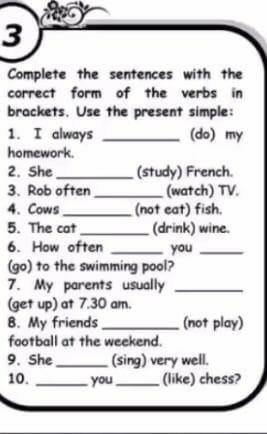 do, studies, watches, don't eat, drinks, do you go, get up, don't play, sings, do you like