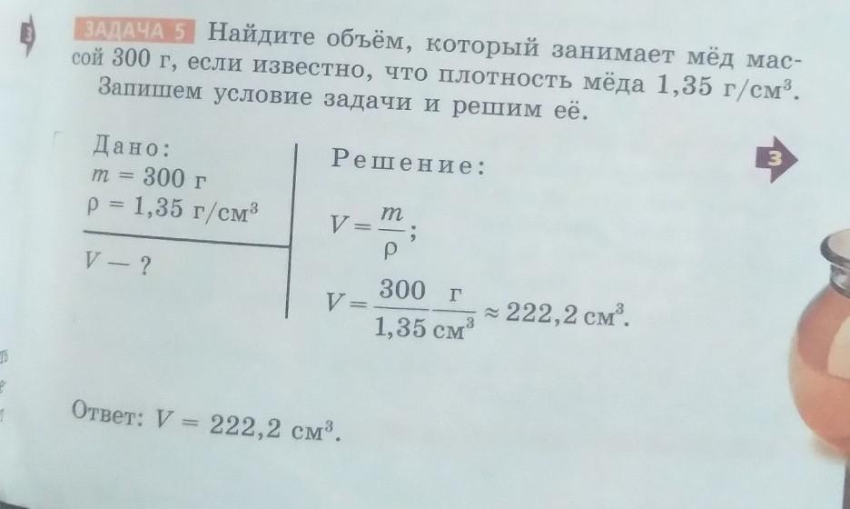 найдите объем ,который занимает мёд массой 300г,если известно,что плотность меда 1,35г/см³.Запишем условие задачи и решим ее.Помогите спочно пж пж пж