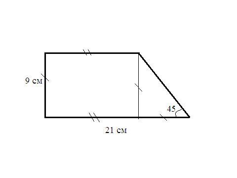 Высота трапеции равна меньшей боковой стороне. Высота, проведенная из вершины тупого угла прямоугольной трапеции, отсекает на большем основании прямоугольный треугольник с углами 45° ⇒ длина отсеченной части равна 9 см. ⇒ меньшее основание равно - (21-9)=12 см.