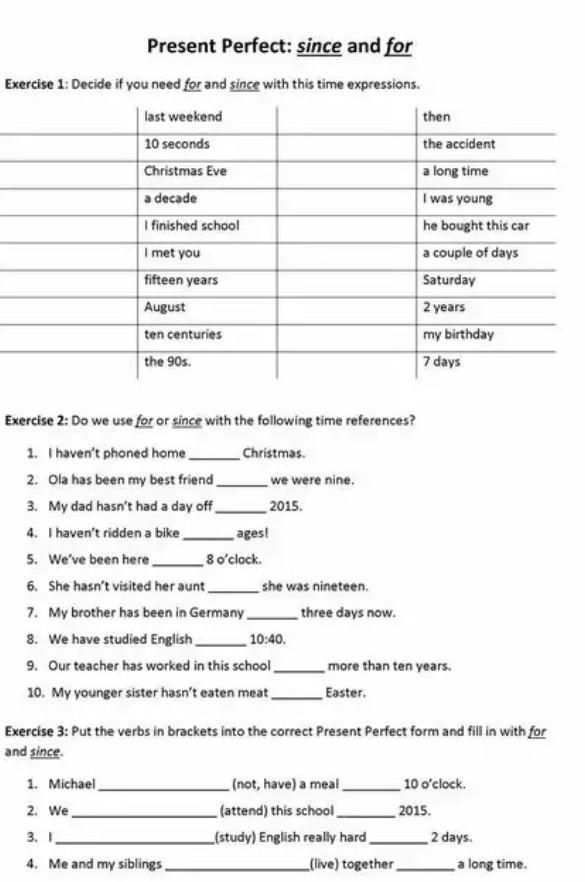Exercise 1: Decide if you need for and since with this time expressions.