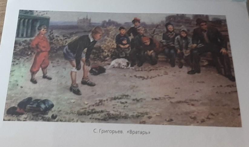 На картине Григорьева изображен теплый осенний день, конец сентября – начало октября. Ветер, сметая, скручивает желтые листья, деревья и кустарники почти обнажены. Пока еще сухая, но уже не ранняя осень. Небо затянуло, как будто пеленою. На заднем плане виднеется город в легкой дымке. Пейзаж – фон, на котором изображены дети. Он написан легко и свободно. Пейзаж подчинен главному рассказу о детях, увлеченных игрой в футбол. Ребята собрались после школы поиграть в футбол на пустыре. Ворота сооружены у них из портфелей, сумок и беретов. Художник не изобразил самого футбольного состязания, поэтому полотно стало еще ценнее. Но туда, куда смотрит вратарь и зрители очень острое положение, может через несколько секунд мяч приблизится к воротам. Все зрители одеты тепло, они сидят в шапках и пальто. Только вратарь в одних трусах, словно на дворе лето. На руках у него перчатки, по которым видно, что мальчик очень опытный и не раз стоял на воротах. Самым ярким пятном картины является красный спортивный костюм мальчика, стоящего позади вратаря. Вратарь стоит, слегка согнувшись, прикрыв ворота и живо реагируя на происходящие, на поле действия. Словно на скамейках, сидят болельщики на досках, сложенных у края дома. Зрители самых разных возрастов: и дети, и дяденька, и маленький ребенок. Все они очарованные игрой следят за ней пристально и очень увлеченно. Сильней всего захвачен матчем мальчик в темно-зеленом костюме. Мужчина - прохожий, который увлекся игрой и остался понаблюдать за ней. Девочки тоже очень сосредоточены. Безразлична к футболу только белая собачка, что дремлет, свернувшись калачиком возле детворы. Художнику удалось объединить персонажей единым действием. Каждой детали найдено свое место и, вместе с тем, каждый персонаж раскрыт убедительно; не случайно картина «Вратарь» является одной из лучших. В ней сочетаются выразительные детали, удачная композиция, мягкий колорит.