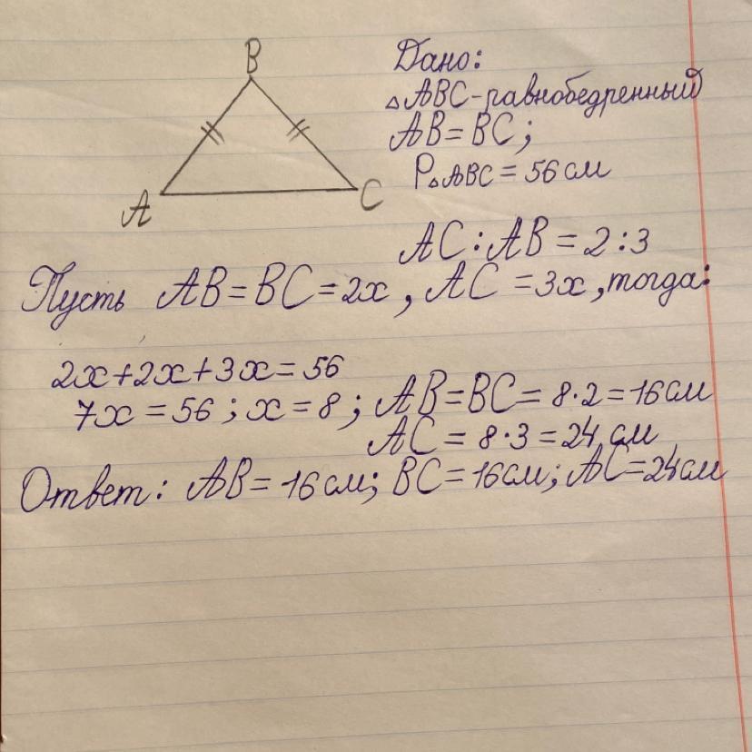 В равнобедренном треугольнике с перриметром 56 см основание относится к боковой стороне как 2:3. Найдите стороны треугольника