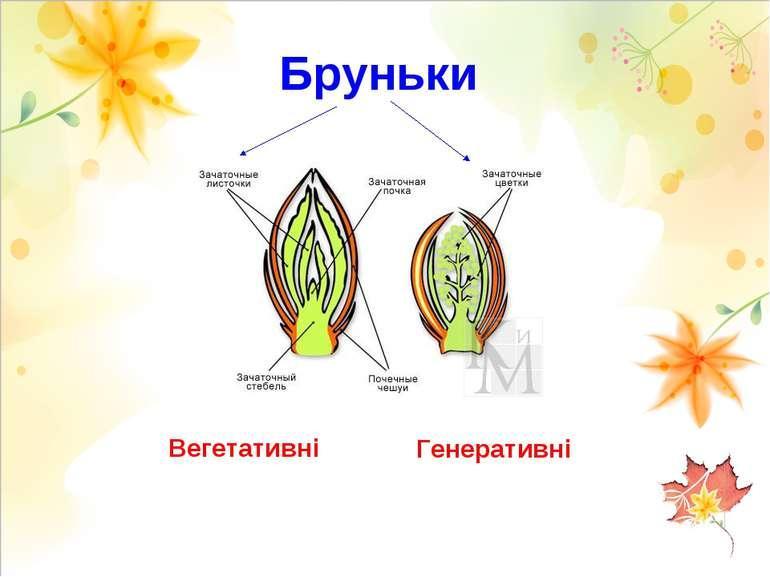 Головна відмінність вегетативної бруньки від генеративної полягає в тому, що із зачатка першого типу виростають стебла і листя рослин, із зачатка другого типу – квітки або суцвіття;