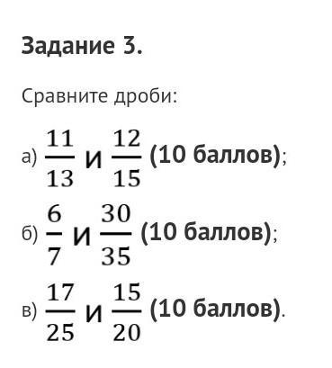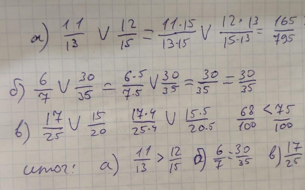 11/13 > 12/15 ; 6/7 = 30/35 ; 17/25 < 15/20
