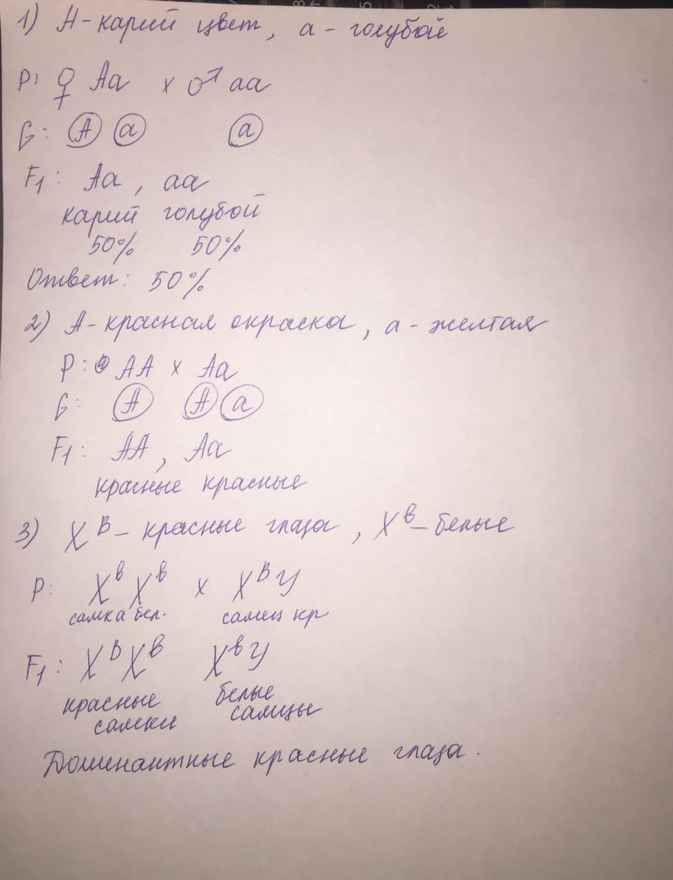 1. У человека ген карий глаз (А) доминирует над голубым цветом глаз (а). Кареглазая женщина (Р), отец которого имел голубые глаза, выходит замуж за голубоглазого мужчину (Х).