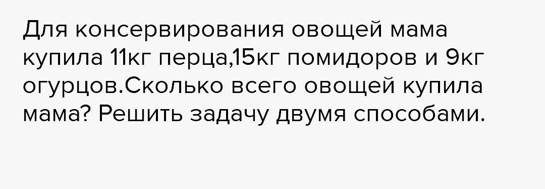 1) 11 + 15 = 26 (кг) - перца и помидоров.