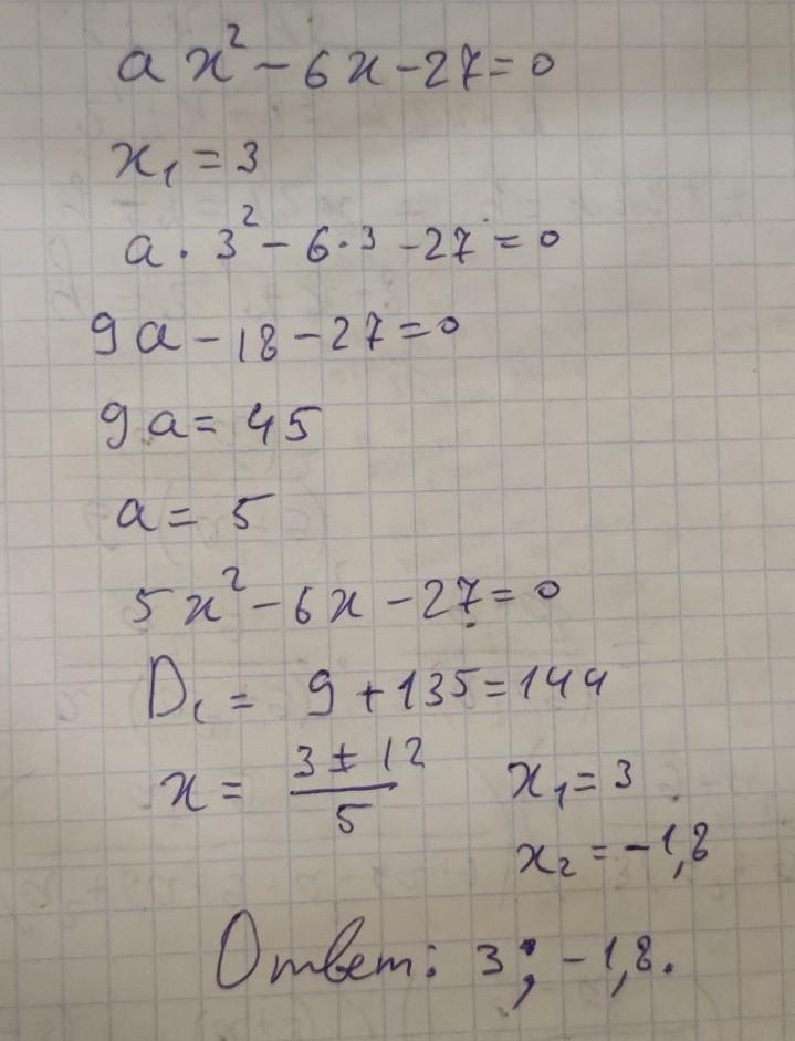 Найдите неизвестный коэффициент уравнения, если известно, что одним из корней уравнения является число 3. Решите полученное уравнение. ax^2 - 6x - 27 = 0