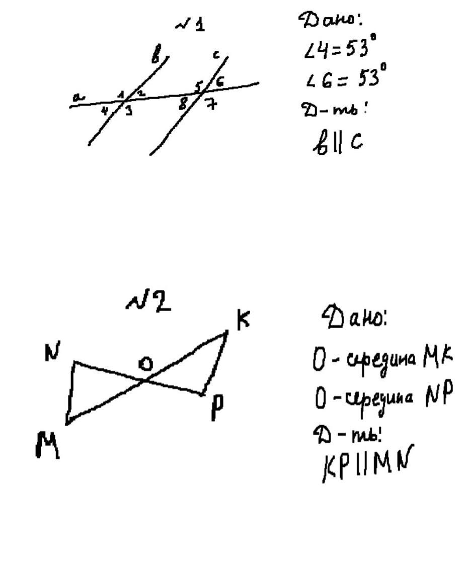 Объяснение:1) буду называть углы в кавычках (например "6") Итак "5" = 180 - "6" = 180 - 53 = 127, "2" = "4" = 53 => "2" + "5" = 53 + 127 = 180 (сумма односторонних углов равна 180 => прямые параллельны) Ч.Т.Д.