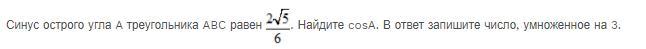 В общем, синус это отношение противолежащего катета к гипотенузе, а косинус прилежащего катета к гипотенузе. У нас sin = 2√5/6, т.е. получается катет = 2√5, а гипотенуза = 6. По теореме Пифагора находим неизвестный катет: 6² - (2√5)² = 36 - 20 = 16, √16 = 4. Катет, необходимый для косинуса, = 4, а сам косинус 4/6 = 2/3 (сокращаем на 2). И по требованию задания умножаем данный ответ на 3: 2/3 * 3 = 2.