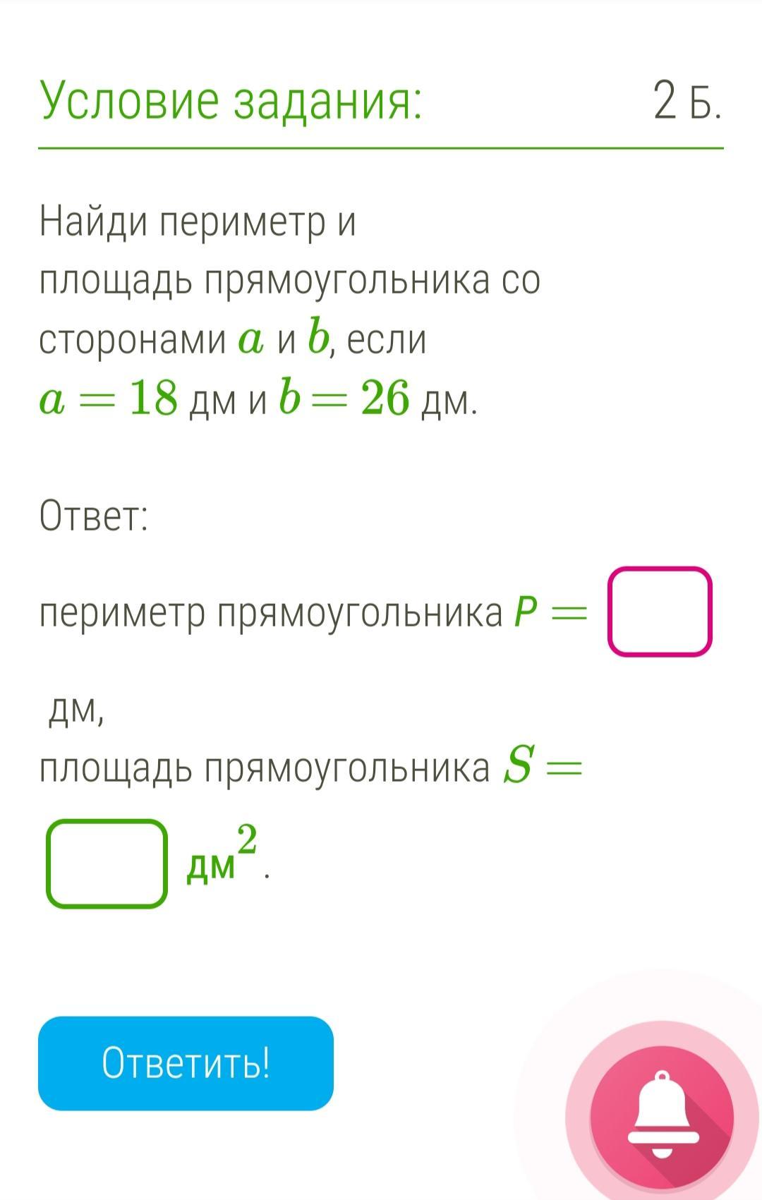 P = 2(18 + 26) = 2 • 44 = 88 дм