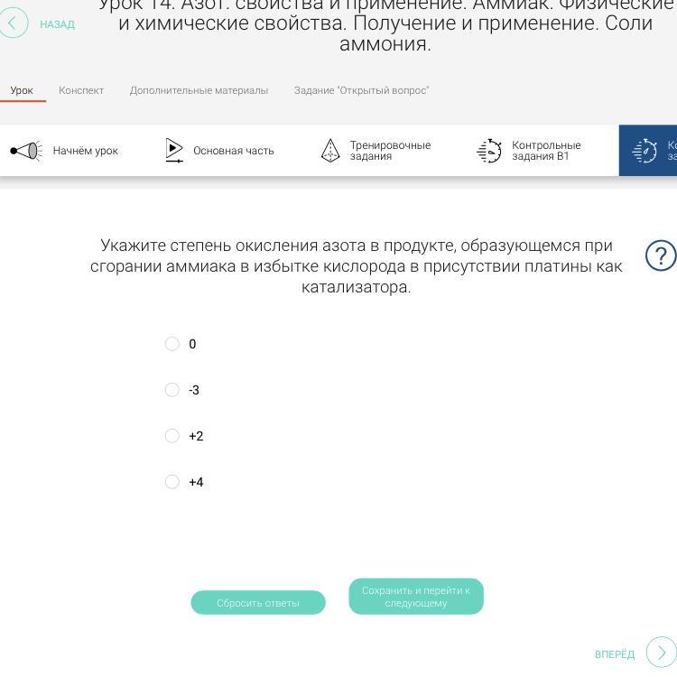 Укажите степень окисления азота в продукте,обращающимся при сгорании аммиака в избытке кислорода в присутствии платины как катализатора . Очень прошу