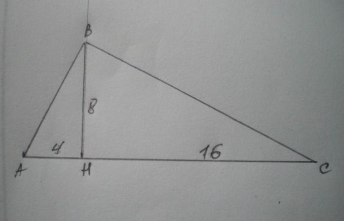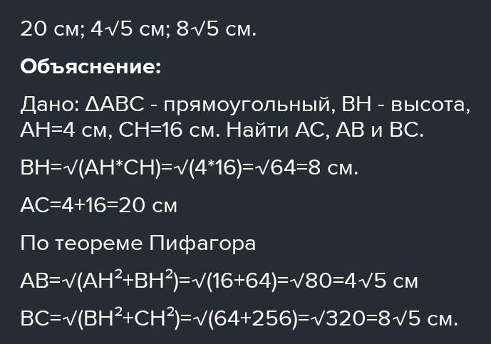 Высота от прямого угла прямоугольного треугольника до гипотенузы делит его на отрезки по 4 см и 16 см. Найдите стороны данного треугольника