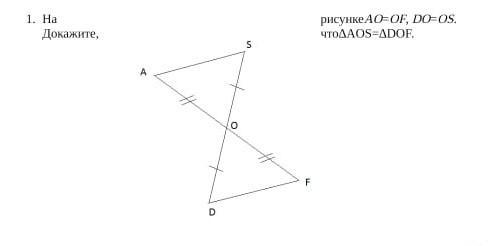 Доказательство: Треугольник ΔAOS = ΔDOF по первому признаку равенства треугольников, так как по условию AO = OF, DO = OS и угол ∠DOF = ∠AOS как вертикальные углы.