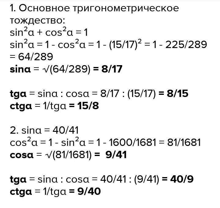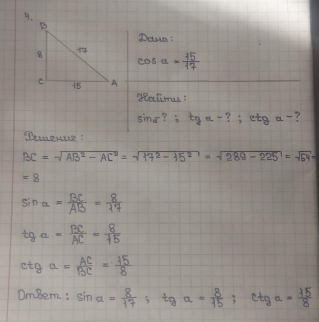 Найдите sinα, tgα, сtgα если cosα=15/17