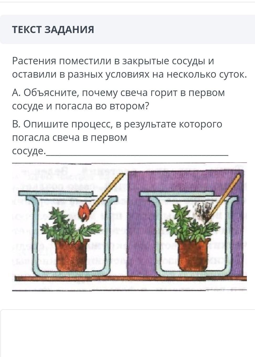 А. Свеча горит, потому что кислород поддерживает горение, а кислород синтезировало растение в процессе фотосинтеза. Но фотолиз воды происходит только в световой фазе фотосинтеза. У одного растения был доступ к этой фазе, у другого не было.