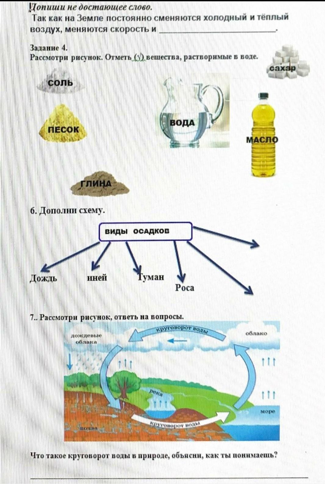 7. Круговоро́т воды в прирооде, влагообороот — процесс циклического перемещения воды в земной биосфере. Состоит из испарения воды, переноса паров воздушными течениями, их конденсации, выпадения в виде осадков (дождь, снег и т. д.) и переноса воды реками и другими водоёмами. Вода испаряется с поверхности суши и водоёмов (рек, озёр, водохранилищ и т. д.), однако большая часть воды испаряется с поверхности Мирового океана. Круговорот воды связывает воедино все части гидросферы.