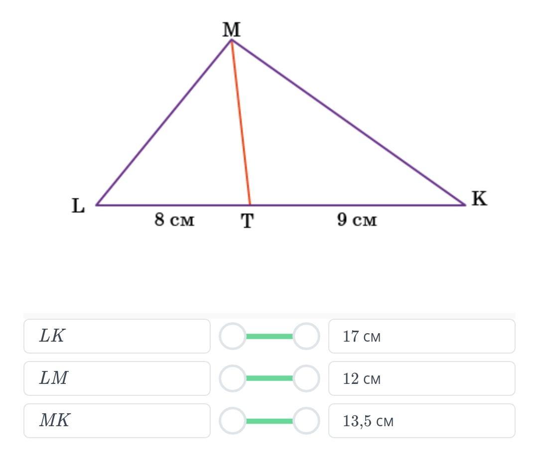 Дан треугольник MLK. Его периметр равен 42,5 см. Биссектриса MT делит сторону LK, на две отрезки равные 8 см и 9 см. Найди длины сторон данного треугольника. СРОЧНО!!!! Даю 100 баллов!!!!