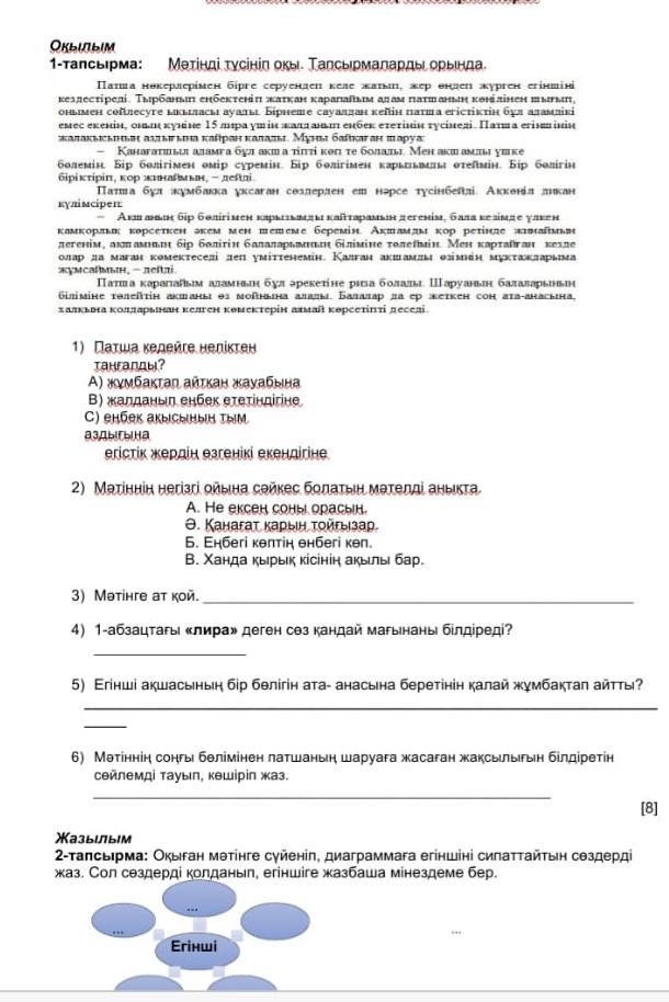 1 а 2 б 3 Хан мен егыншы 4 лира ақша өлшемі, 5 карызымды отеймын дейды 6 Шаруанын балаларынын былымге толейтын акшаны оз мойнына алады.