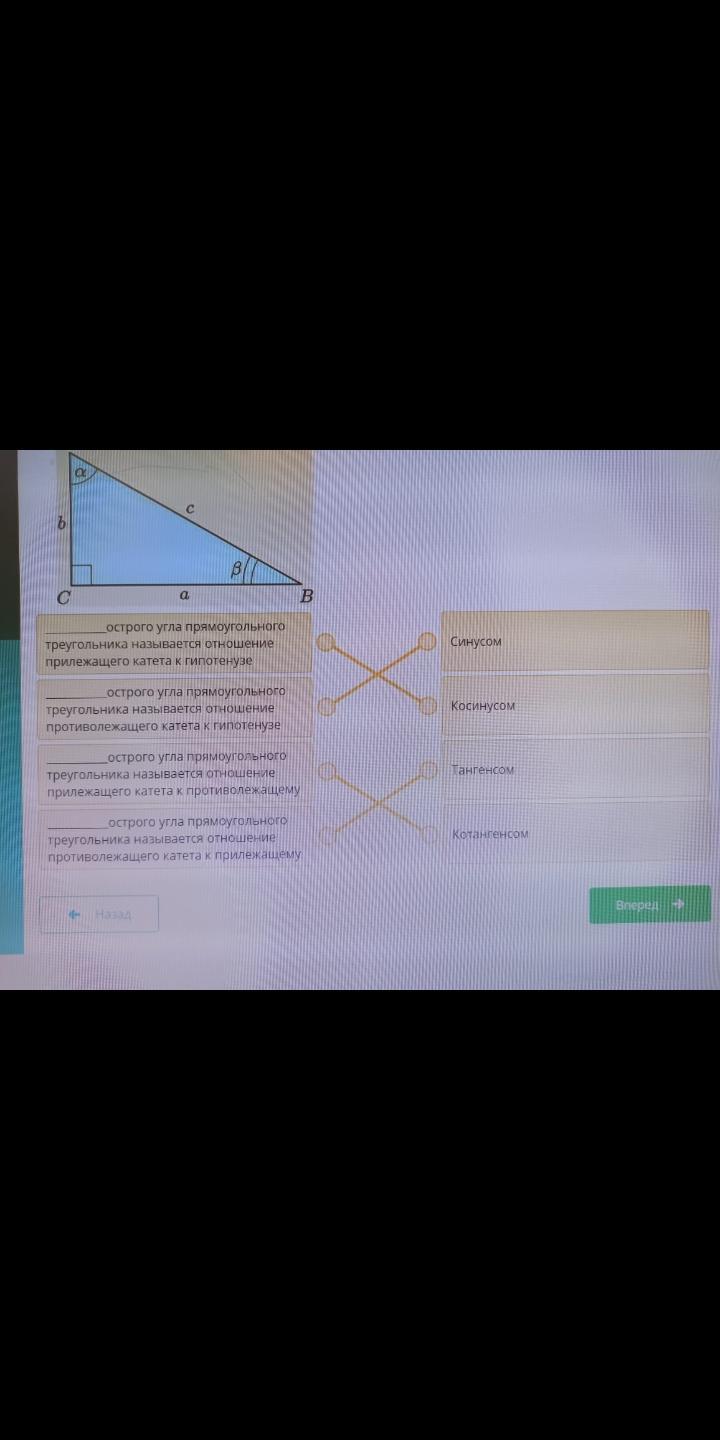 Дан прямоугольный треугольник ABC с прямым углом C Установите соответствие между отношениями сторон И тригонометрическими функциями острого угла. люди пожалуйста помогите как по-братски