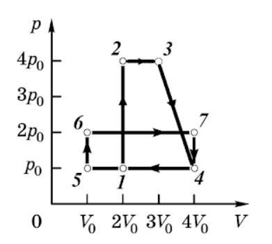 Найти ƞ1/ƞ2 - отношение коэффициентов полезного действия циклов 1-2-3-4-1 (ƞ1) и 5-6-7-4-5 (ƞ2) показанных на рисунке. В обоих циклах участвует 1 моль идеального одноатомного газа.