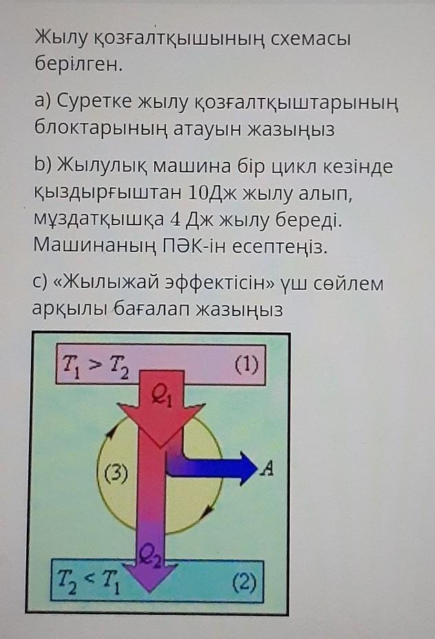 б) Жылу қозғалтқыштың атқаратын жұмысының, қыздырғыштан алатын жылу мөлшеріне қатынасын жылу қозғалтқыштың пайдалы әсер коэффициенті (ПӘК) дейді.