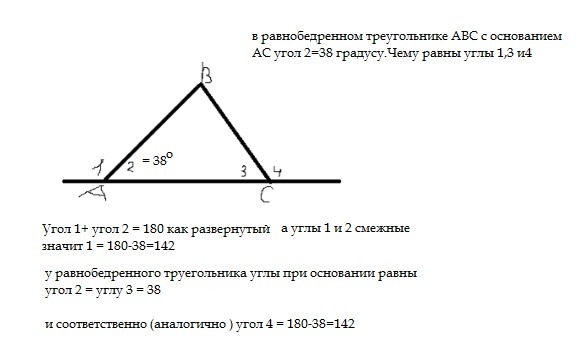 в равнобедренном треугольнике ABC с основанием AC угол 2=38 градусу.Чему равны углы 1,3 и 4