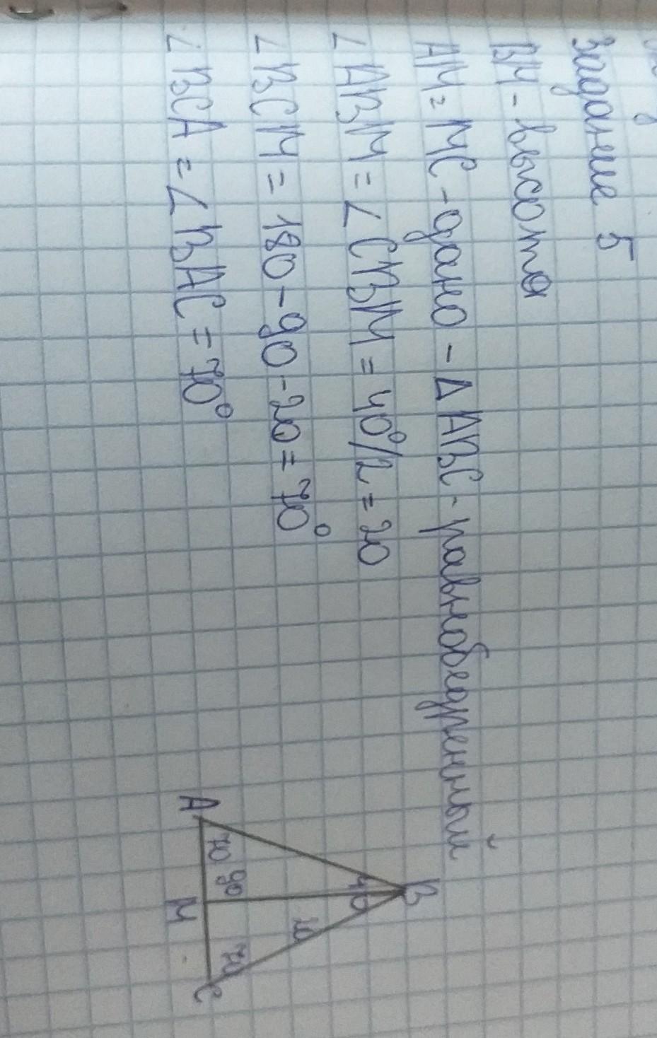 5. В треугольнике ABC точка M - середина стороны AC, угол BMA = 90°, угол ABC = 20°, угол BAM = 80°. Найдите угол MBC и угол BCA.