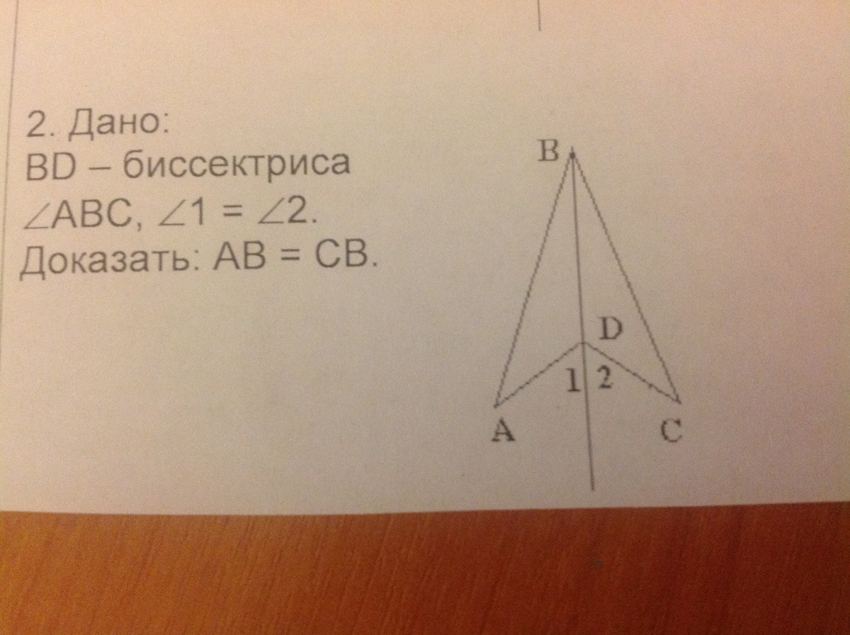 если угол 1 равен углу 2, значит и смежные с ними углы равны, то есть угол ADB= углу CDB. Значит треугольники равны по стороне и двум прилежащим к ней углам. А значит и АВ=СВ