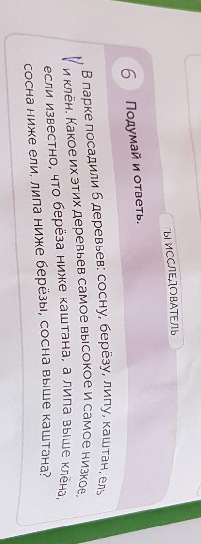 В парке посадили 6 деревьев сосну берёзу липу каштан ель и клен. Какое их этих деревьев самое высокое и самое низкое, если известно,что береза ниже каштана,а липа выше клена,сосна ниже ели,липа ниже берёзы,сосна выше каштана?