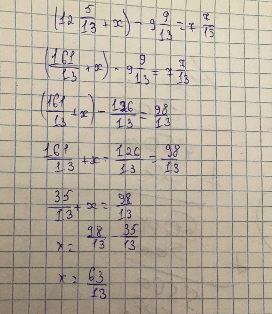 Реши уравнение: (12, 5/13 +x) - 9, 9/13= 7, 7/13