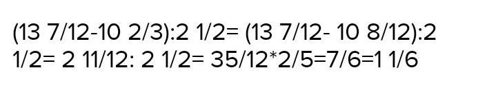 найдите значение выражения которое представляет собой: частное разности чисел 13 целых 7/12 и 10 целых 2/3 и числа 2 целых 1/2. Помогите пожалуйста!!!