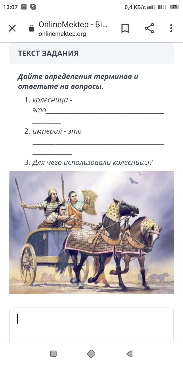Колесни́ца — большая двухколёсная повозка (двуколка), использующая как движущую силу скаковых животных[1]. Колесница в ходе развития военной мысли, начиная с 2000 лет до нашей эры, превратилась в один из решающих факторов при ведении боевых действий.