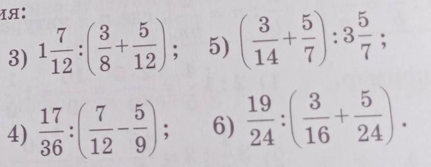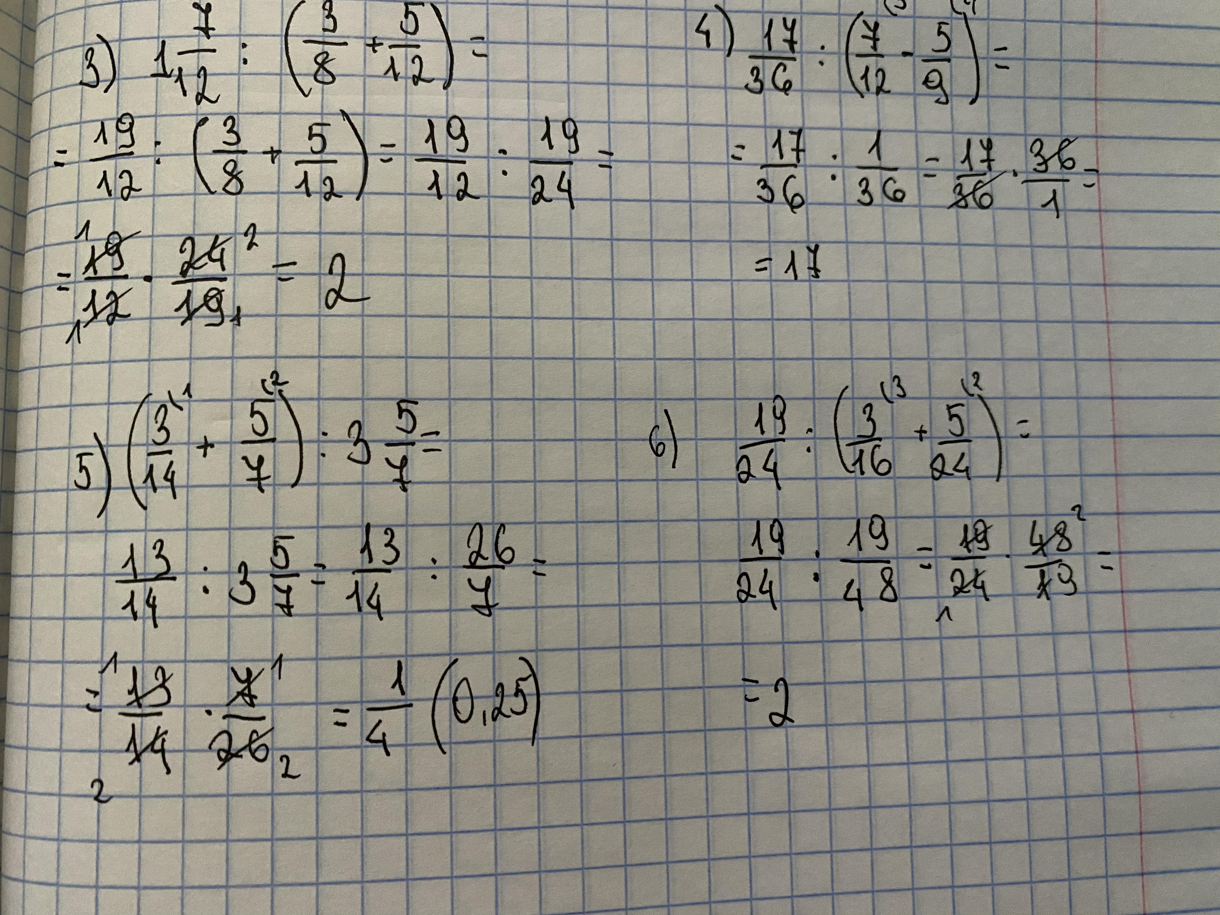 5) (3/14 + 5/7) : 3 5/7 = (3/14 + 10/14) : 3 5/7 = 13/14 : 3 5/7 = 13/14 : 26/7 = 13/14 * 7/26 = 1/4 = 0,25