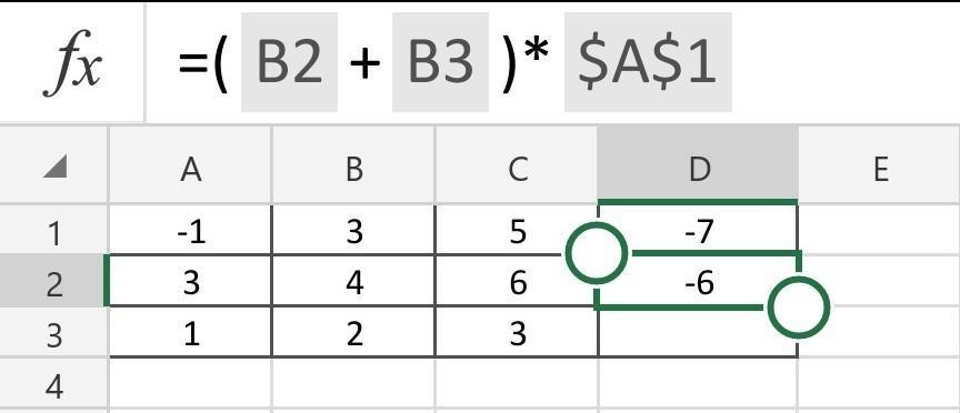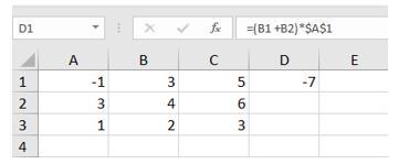 Формулу, записанную в ячейке D1, скопировали в буфер обмена и вставили в ячейку D2, при этом изменились относительные ссылки, использованные в формуле.